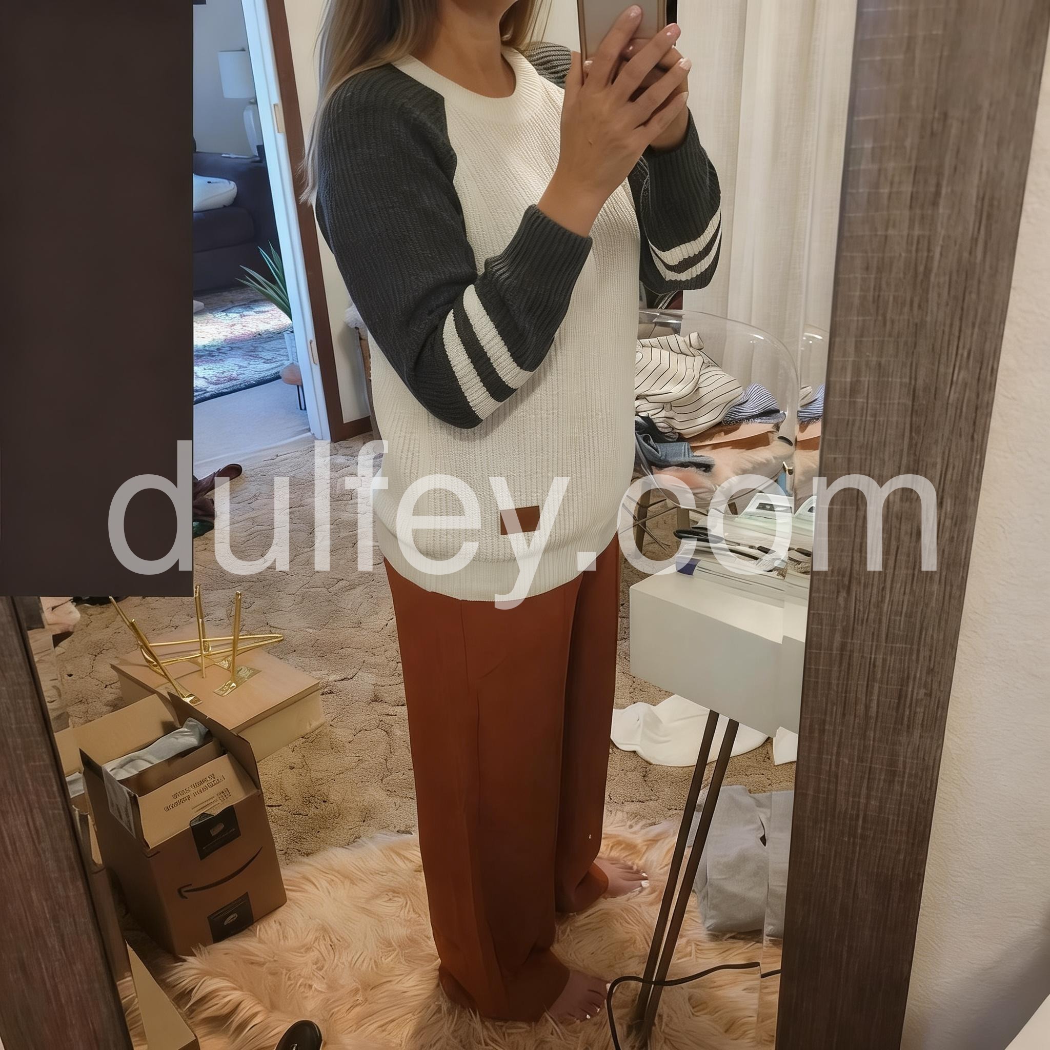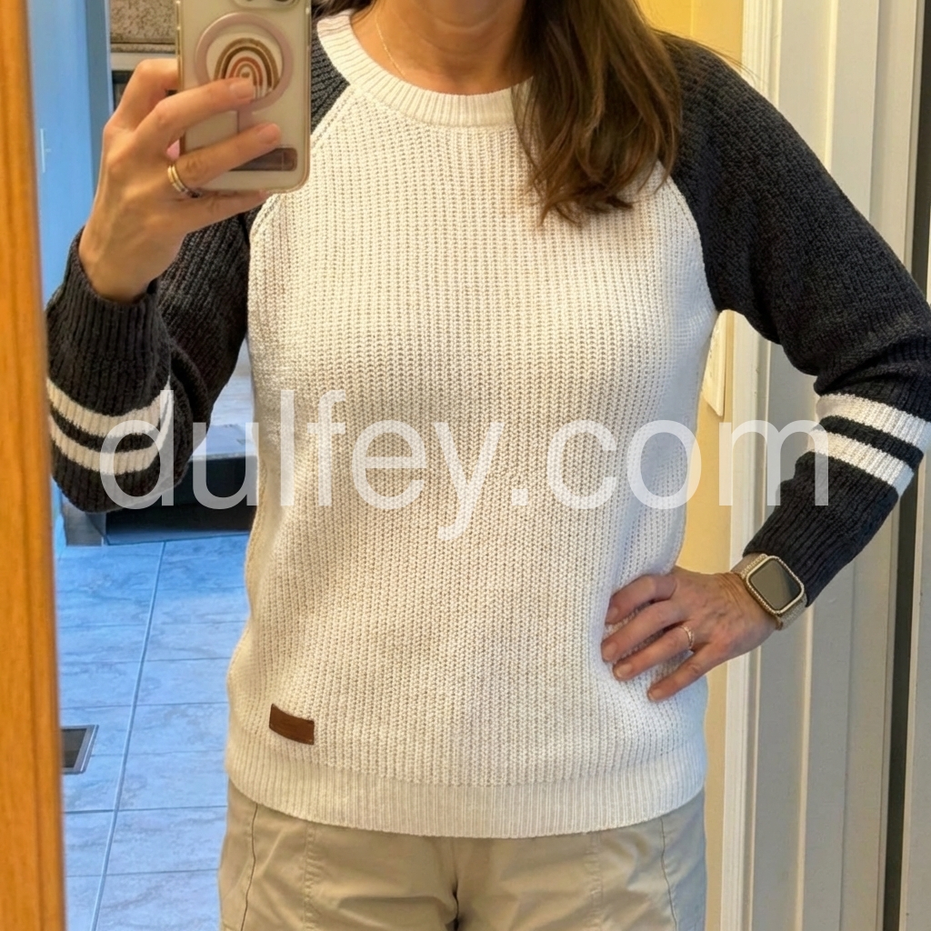 This Comfy Grey Knit Sweater features a crisp white body complemented by stylish striped cuffs, blending classic design with subtle accents. Crafted from soft knit fabric, it offers warmth and comfort for everyday wear. The contrasting cuffs add a refined touch that elevates your casual look with ease. Ideal for layering or wearing solo, this sweater combines practicality with understated style.