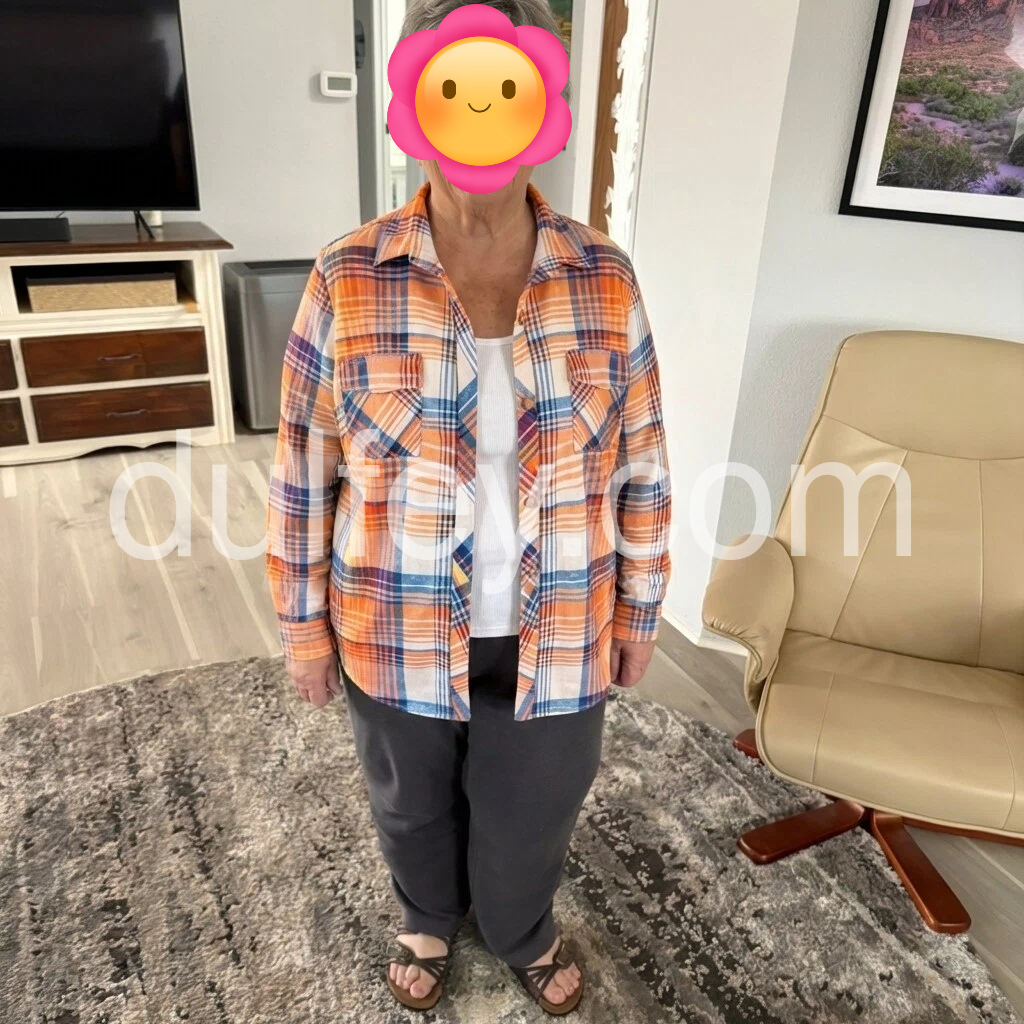 Wear this classic plaid print top to game day, a casual day or night out, and more with its laid-back vibe. A bright orange and blue all-over plaid print with buttons down the front, a fold-over collar, and long sleeves make it great for layering with a t-shirt or camisole underneath, jeans, or leggings.