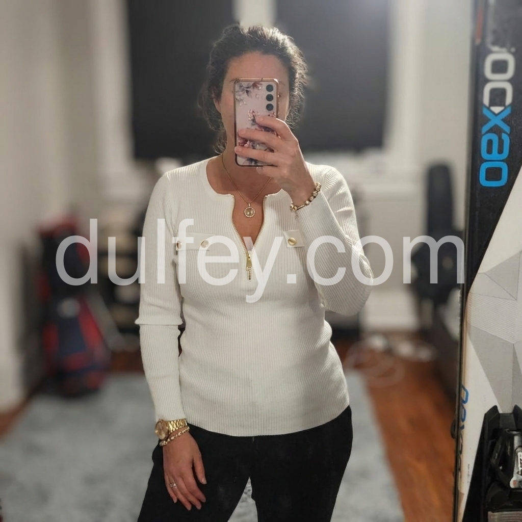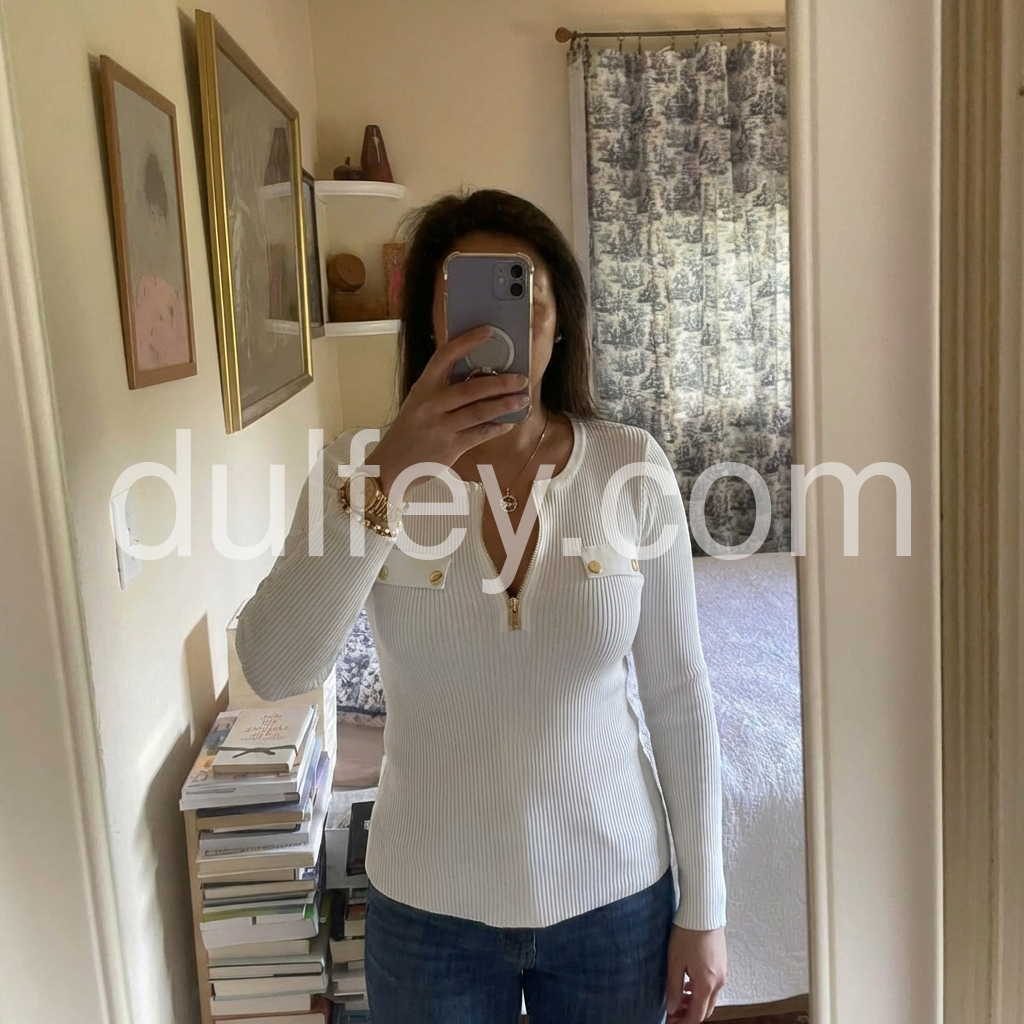 Elevate your wardrobe with our Chic Zip V-Neck White Plain Knit Top. The stylish v-neck neckline and subtle zip feature add a touch of sophistication to any outfit. Made from high-quality, soft knit material, this top is both comfortable and versatile. Perfect for any occasion, elevate your style with this must-have piece.