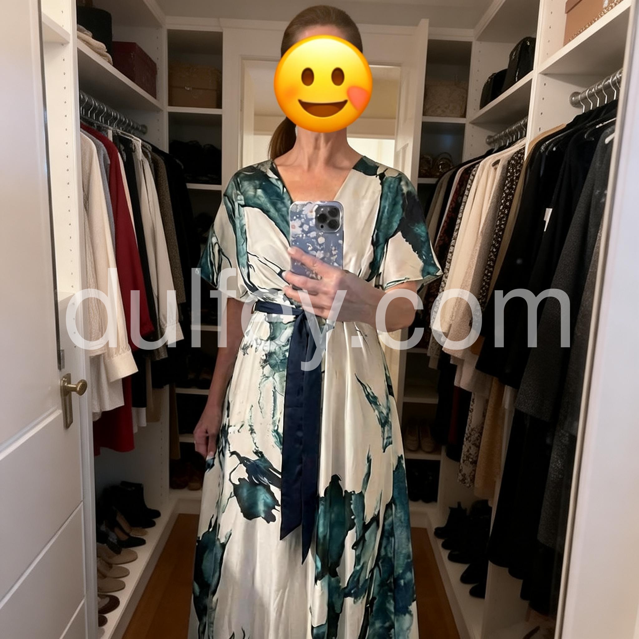 This trendy V-neck short sleeve maxi dress is the perfect addition to your wardrobe. Made with a flattering v-neck design and short sleeves, this dress is both stylish and comfortable. The maxi length adds sophistication, making it a versatile option for any occasion. Upgrade your look with this must-have piece.