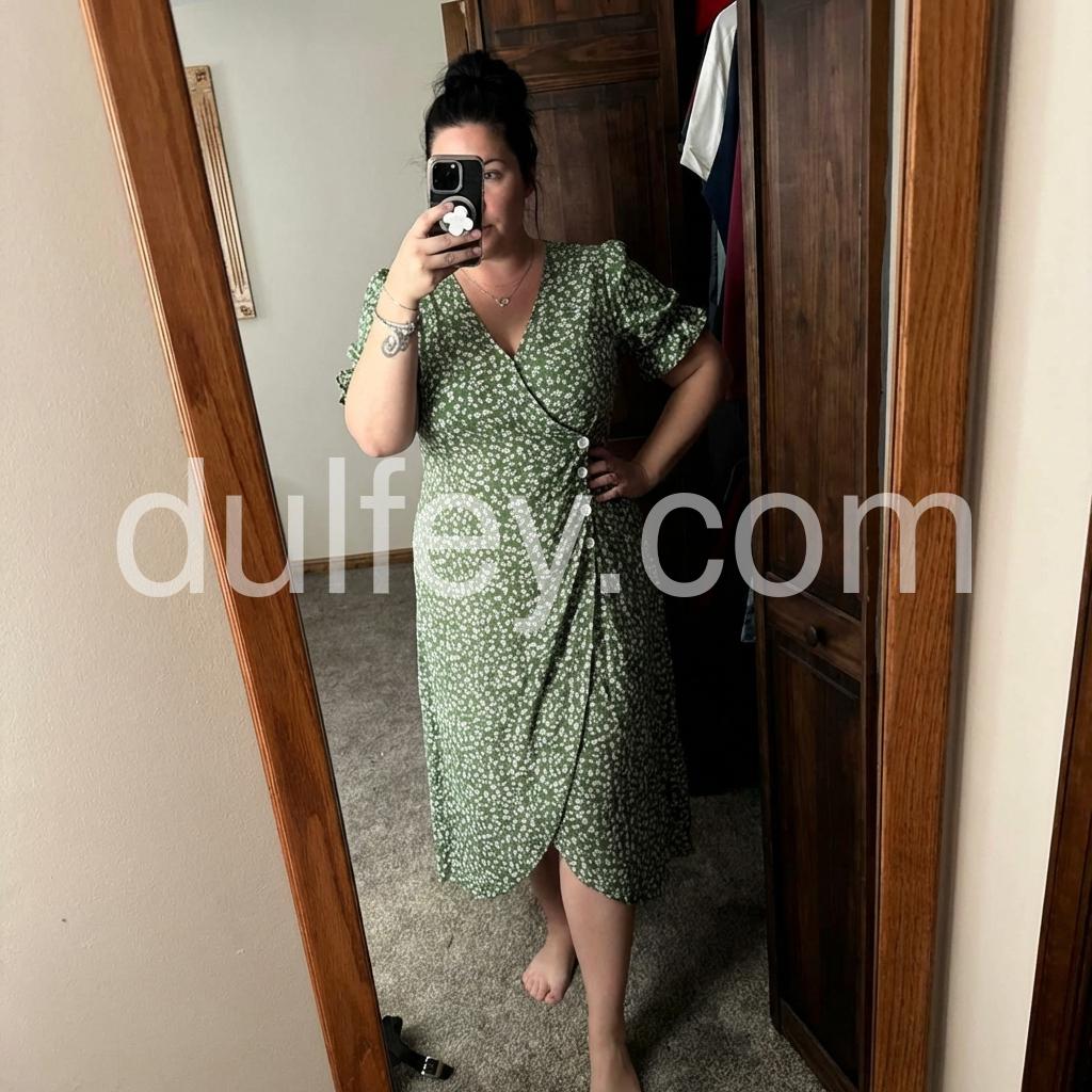 Get ready for summer with this sage green midi dress. Short sleeves with pleats on the front and buttons give it a cinched bodice and detail. The v-neck complements your favorite layering necklaces, accentuated by the mid-calf silhouette with an uneven hem. Finish your look with sandals, heels, or wedges.