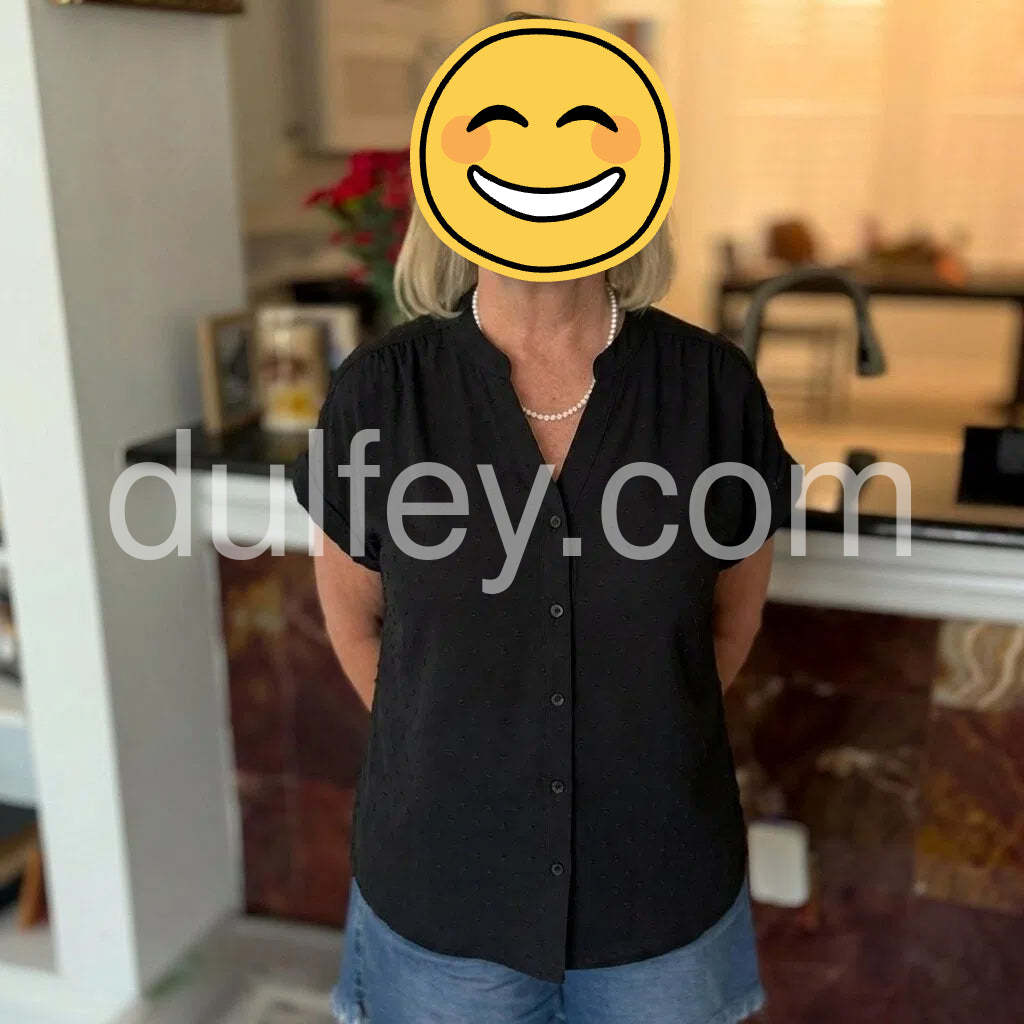 Get back to basics with this simple black top. Buttons down the front with a fold-over collar lend a classic vibe, upgraded with modern short sleeves rolled up for a casual look. Tuck this black blouse in with jeans or a skirt, or leave it out for a flowy style.