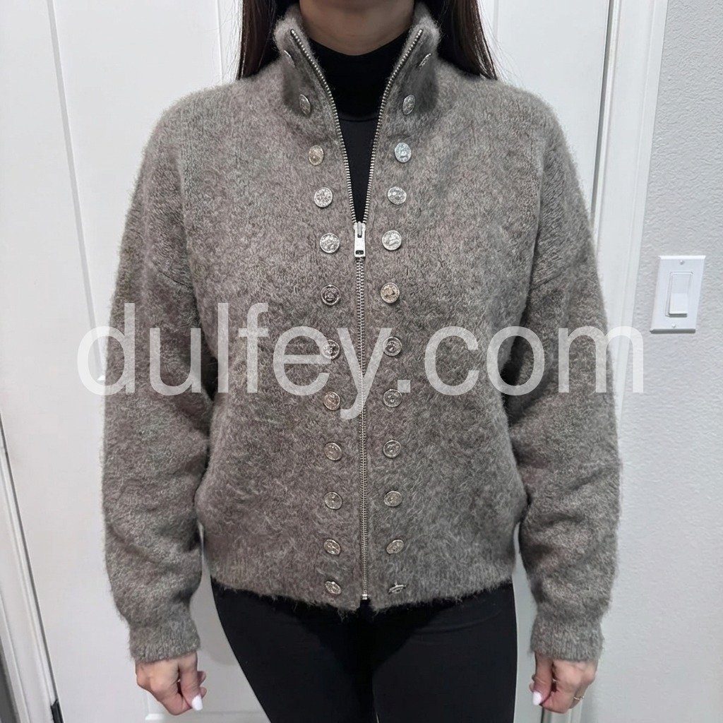The Fuzzy Grey High Neck Long Sleeve Cardigan is a cozy and stylish addition to any wardrobe. Made with a high neck and long sleeves, it provides warmth and comfort during colder months. The fuzzy texture adds a touch of softness and style, making it a versatile piece for any outfit.