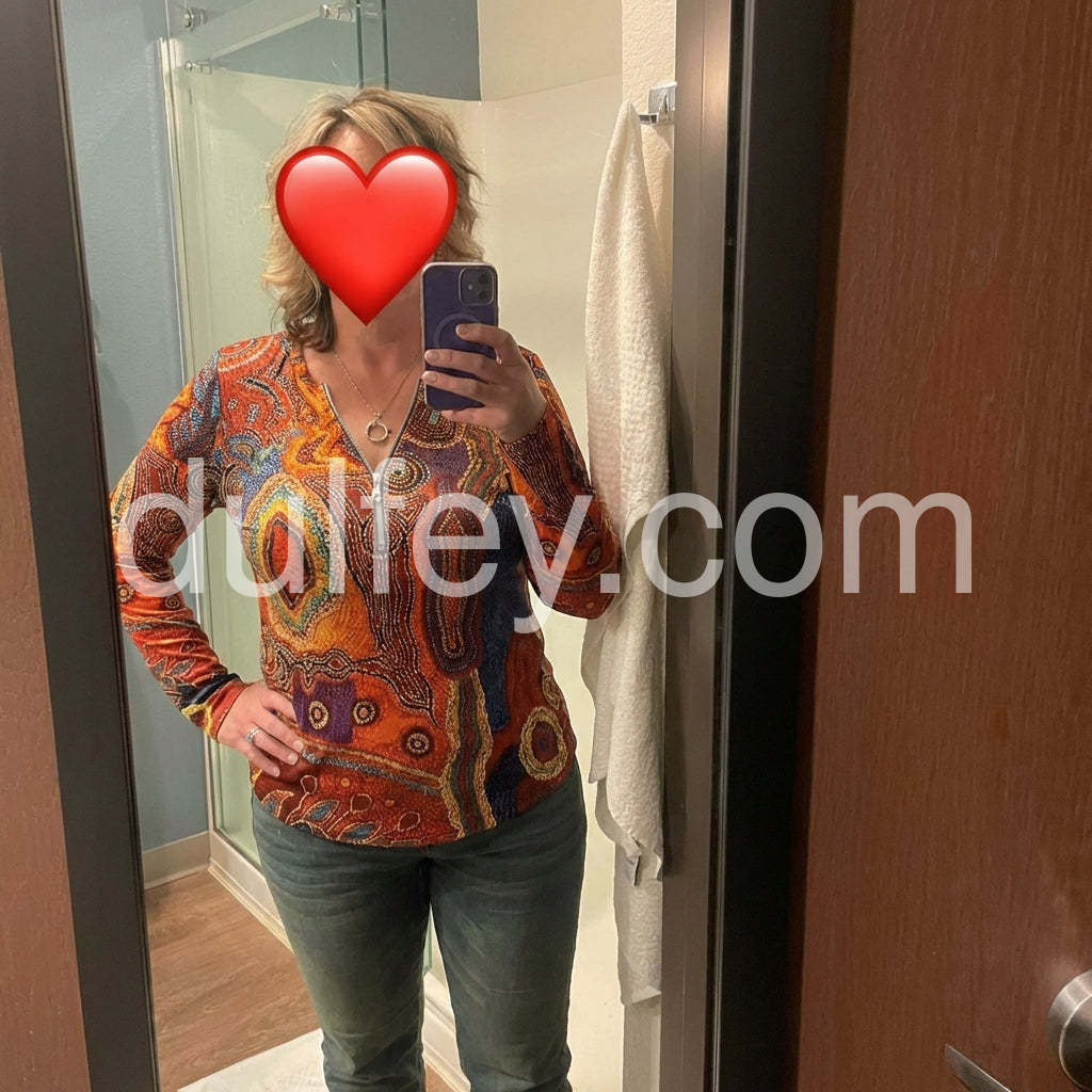 Zip it up with this autumn color casual top, featuring red, orange, blue, and yellow geometric swirls and bead print patterns. The long fitted sleeves, zippered plunging v-neckline, and waist-length silhouette give this laid-back top just the right amount of detail. Finish your look with silver or gold jewelry, jeans, and a cami underneath. Machine wash cold tumble dry low to medium heat. Iron if needed or lay flat to dry.
